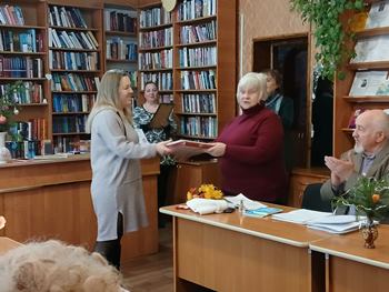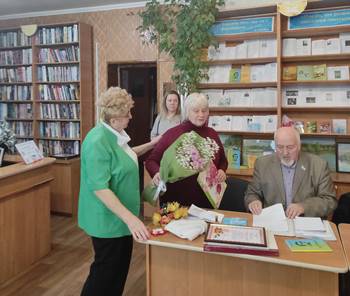 Валентина Василівна отримала вітальний лист з нагоди дня народження від начальника відділу культури і туризму Хмільницької міської ради Юлії Цупринюк, який вручила провідний спеціаліст відділу Лілія Крамар. Теплі слова іменинниці дарували : директорка КЗ «Хмільницька публічна бібліотека» Олена Бугайова, староста любительського об’єднання «Читацьке коло» Ніна Бойко, поетеса, координатор творчого об’єднання «Божський острів» Оксана Гавура, керівник літературно – мистецького об’єднання «Золота троянда» Микола Заруба.
